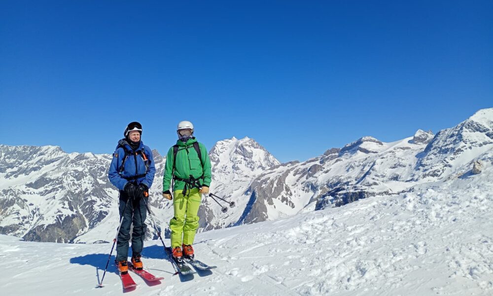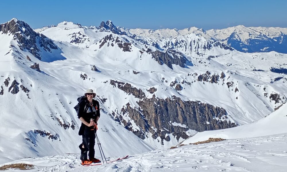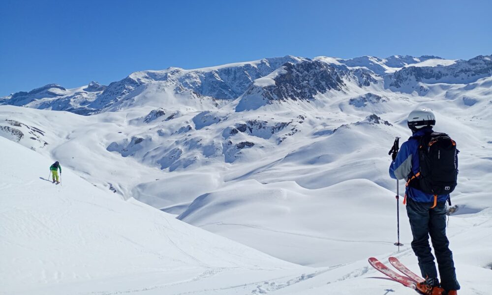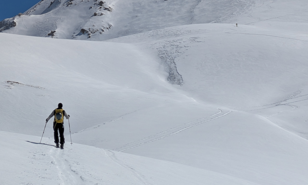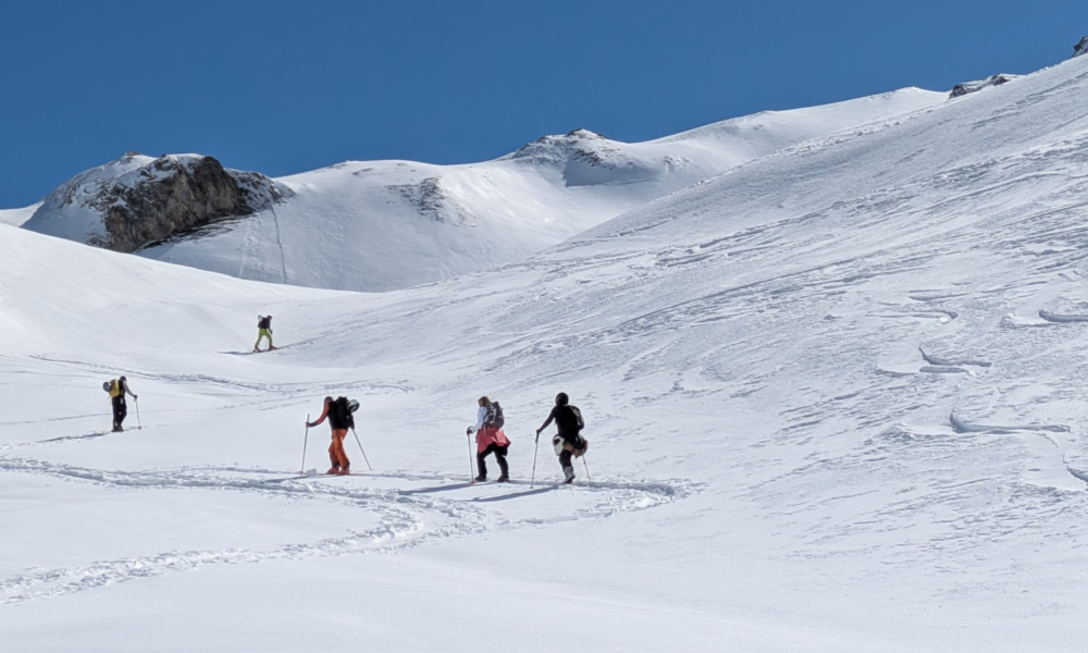 From the top of Chandrossa we traversed out to the right under Roc Merlet arriving at the first short uphill section. Now to test my transition skills, was I going to remember to take everything out of my rucksack I needed, put what I didn’t need in, and not let my skis go shooting off down the slope with the breaks off? Remarkably, all my lessons and practice came together, and I was ready to go without my usual faffing.