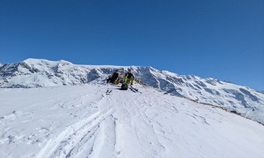 The snow was firm most of the way up but started getting softer at the top, and would occasionally give way under the downhill ski adding to the effort. Nearer the top I was having to stop about every 20m to get my breath but eventually joined Paul and Chris at the top at 13:30 just in time for lunch! And lunch always tastes so much better when you’ve earned it, and on a windless peak in the sunshine (having spent many years walking in the Lake District it never ceases to amaze me that you can be on top of a mountain in the Alps and it not windy, I thought that was the rule, except once in a blue moon.)