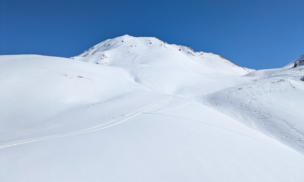 This ascent was about 500 meters to the summit of 2680. I’ve been staying in Brides-les-Bains which is at 600 meters so this was 2000 meters above my comfort zone! Fortunately Chris and Paul were consolidating the skinning tracks ahead making it easier for me to make my way.