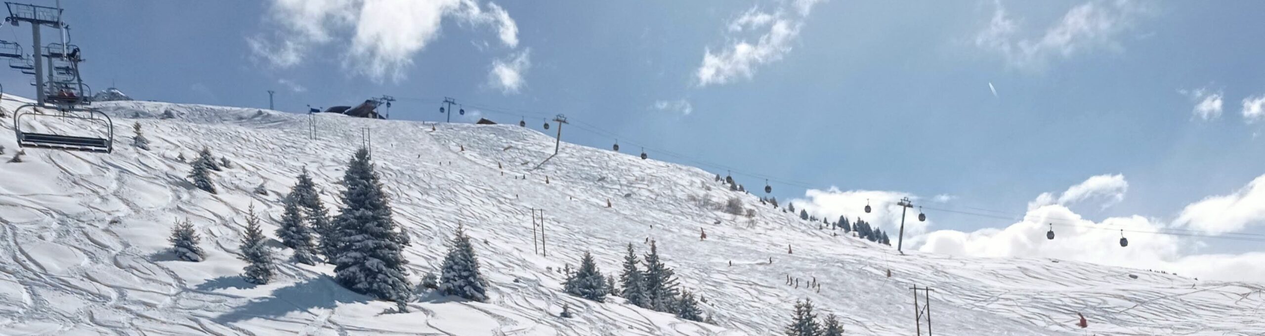 The Meribel Meadows are bounded by the Marmotte (blue) and Mauduit (red) pistes. The Folie Douce sits at the top of the meadows and the Rhodos mid-station at the bottom. They are bisected by the Chamois (red) piste.